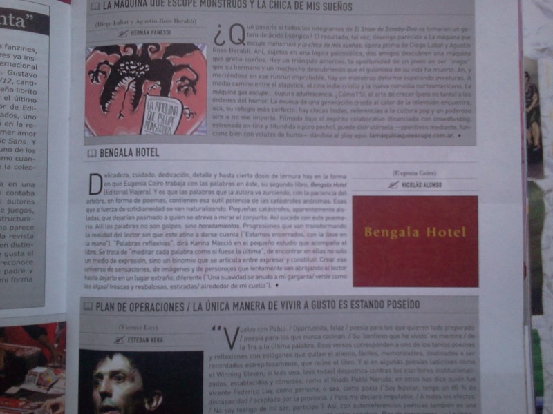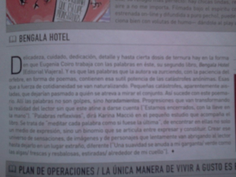 Delicadeza, cuidado, dedicación, detalle y hasta cierta dosis de ternura hay en la forma en que Eugenia Coiro trabaja con las palabras en este, su segundo libro, Bengala Hotel (Editorial Viajera, 2011). Y es que las palabras que Coiro va zurciendo, con la paciencia del orfebre, en forma de poemas, contienen esa sutil potencia de las catástrofes anónimas. Esas que a fuerza de cotidianeidad se van naturalizando. Pequeñas catástrofes aparentemente aisladas que dejarían pasmado a quién se atreva a mirar el conjunto.