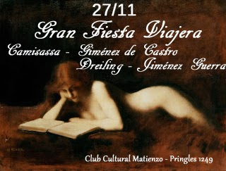 Categorías Adelantos Eventos Viajeros 27/11 – Gran Fiesta Viajera Autor de la entrada Por Karina Macció Fecha de la entrada 09/11/2013 Etiquetas Eduardo Camisassa, María Florencia Giménez, Martín Jiménez Guerra, Mauricio Dreiling, Viajera ← «Cusco» de Jorge Alejandro Vargas Prado – IV Festival de Poesía de Lima → «Las Viejitas Amalaya», de Eduardo Camisassa. (Fragmento)