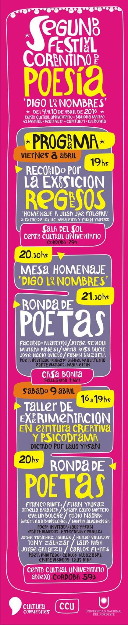 Categorías Adelantos Ferias Carlos Flores en el II Festival de poesía correntino Digo los nombres Autor de la entrada Por Eugenia Coiro Fecha de la entrada 10/04/2016 Etiquetas Carlos Flores, Portada ← La quebrada del león * Axel Levin → Montgomery de lana roja * Cristina Eseiza