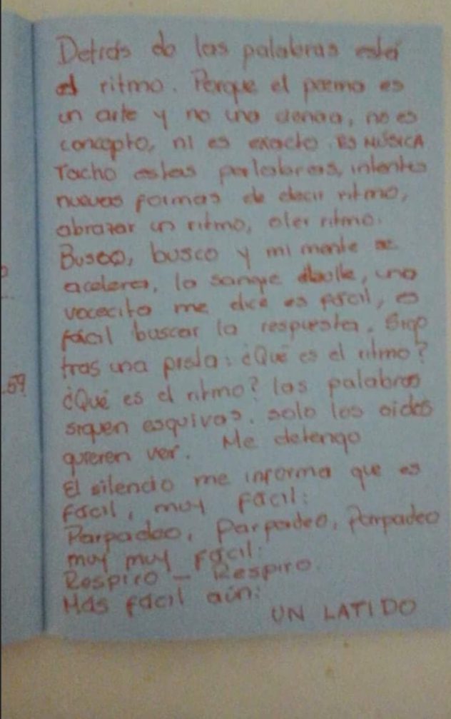 Detrás de las palabras está el ritmo.Porque el poema es arte y no ciencia, no es concepto ni es exacto. ES MÚSICA. Tacho estas palabras, intento nuevas formas de decir ritmo, abrazar un ritmo, oler ritmo. Busco, busco y mi mente se acelera, la sangre bulle. Una vocecita me dice es fácil, es fácil buscar la respuesta.Sigo tras una pista: ¿qué es el ritmo? (suspiro). Las palabras siguen esquivas, solo los oídos quieren ver. Me detengo. El silencio me informa que es fácil, muy fácil